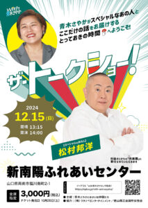 12月15日 (日)に新南陽ふれあいセンターにて「ザ・トークショー」が開催されます。青木さやかさんがスペシャルなあの人とここだけの話をお届けしてくれます。スペシャルゲストに松村邦洋さん。